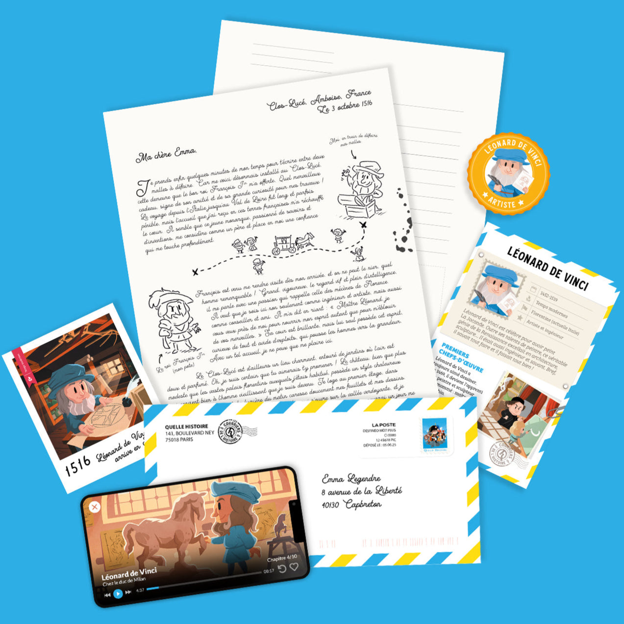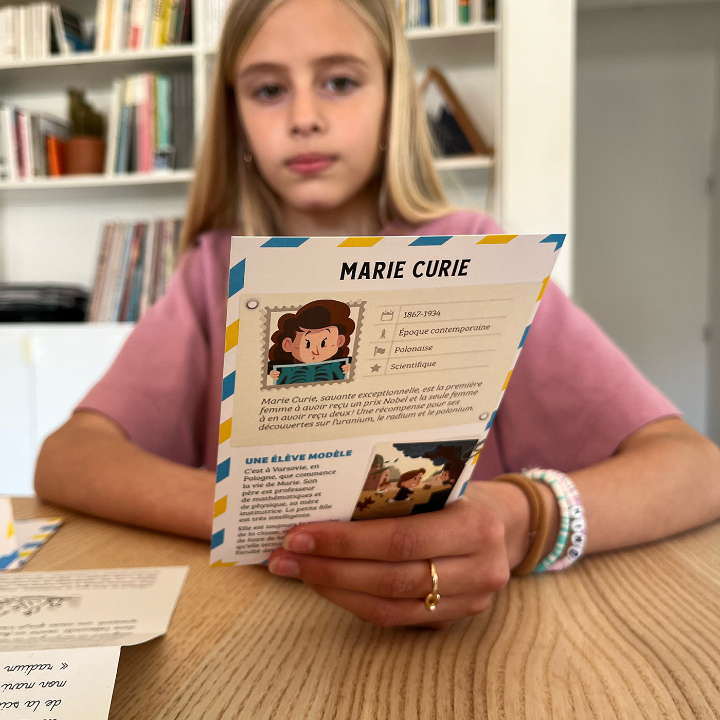 Chaque mois, votre enfant reçoit une lettre, à son nom, écrite par un grand personnage de l’histoire. Un mois, c’est Marie Curie qui lui confie ses secrets. Le suivant, Léonard de Vinci qui lui parle de ses rêves les plus fous…